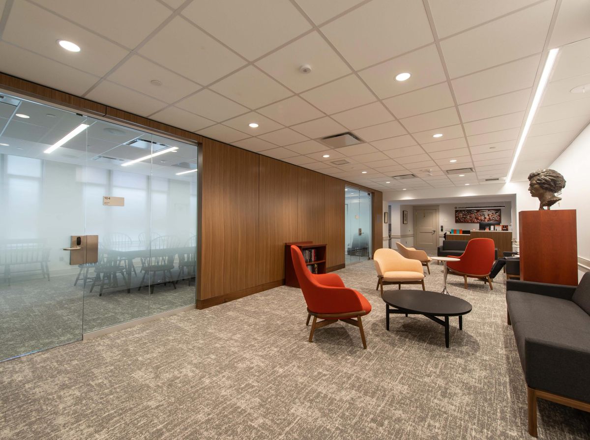 Since 1964, the building has housed the offices of the Dean of Undergraduate Students (ODUS) and the Dean of the College (ODOC). In 2017, West College was renamed Morrison Hall to honor Nobel laureate, author, scholar, activist, and longtime Princeton professor Toni Morrison. M+Sa first renovated portions of Morrison Hall’s fourth floor for ODOC and conducted several feasibility, programming, and concept design studies to determine the best options for new or renovated programs. The Department of African American Studies (AAS) and the American Studies (AMS) Department were subsequently relocated to space on several floors of Morrison. M+Sa prepared design and construction documents and administered construction for these renovations which included: new offices for AAS at the lower level, first, and second floors; new offices for AMS on the second floor, new shared meeting and common spaces throughout, three new seminar rooms with full AV capabilities, and new barrier free restrooms. In addition, the ODUS conference room was reconfigured and expanded on the third floor.
