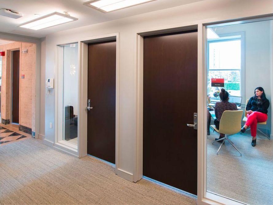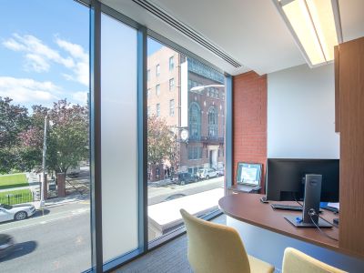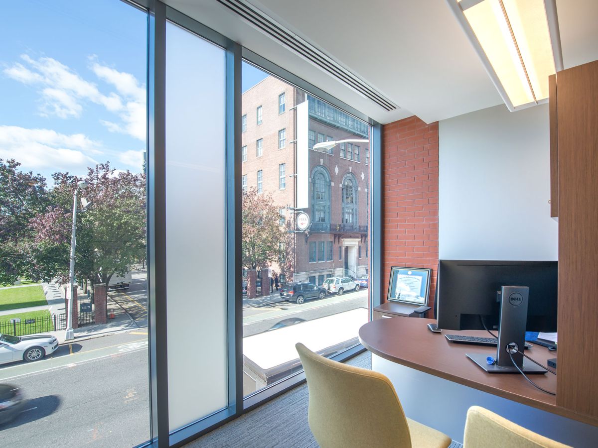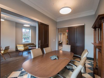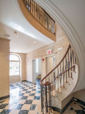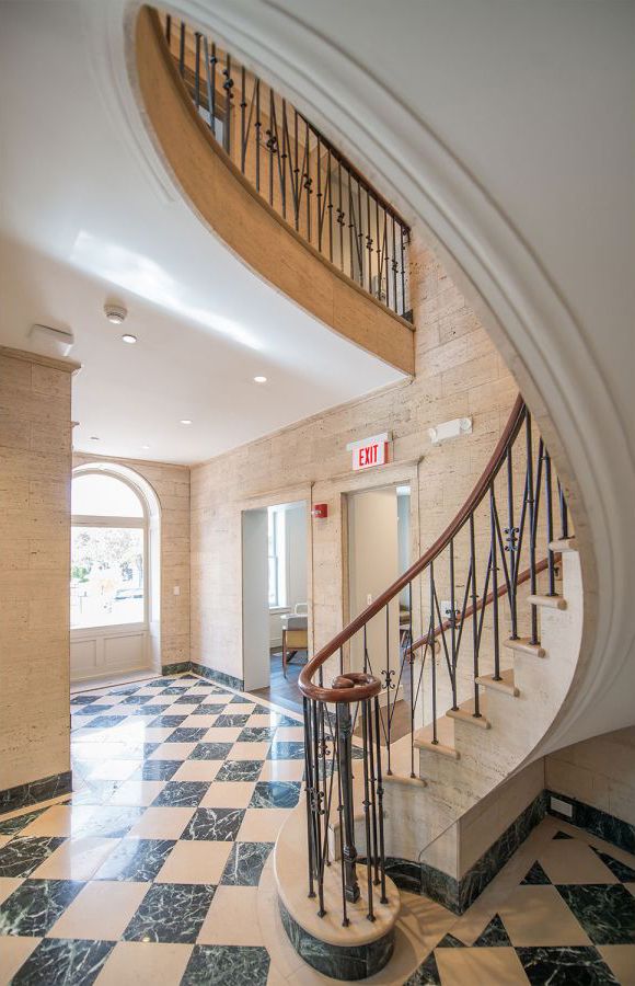 Mills + Schnoering Architects designed a renovation of and new addition to 47 Central Avenue for use as Rutgers-Newark’s University Foundation offices and alumni event space. The recently completed project restored the exterior of the original building. On the interior, character-defining historic features were preserved and restored, including an original curved marble stair and entrance floor, domed plaster ceiling, travertine walls, and stately fireplace, while providing accessible and modern program spaces. Other spaces were renovated and adapted to the new office and reception use.