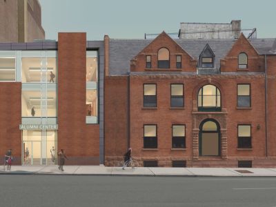 An addition has been constructed to the north of the existing building. The new addition respects the existing building in terms of scale and material while providing an accessible entrance and new vertical circulation by means of an elevator and fire stairs. Comprising alternating bays of glass and masonry units, the addition is light-filled and welcoming, with cast stone complementing the color and texture of the existing historic brickwork. The lobby of the addition serves as a welcoming gathering area for students, staff, and returning alumni.