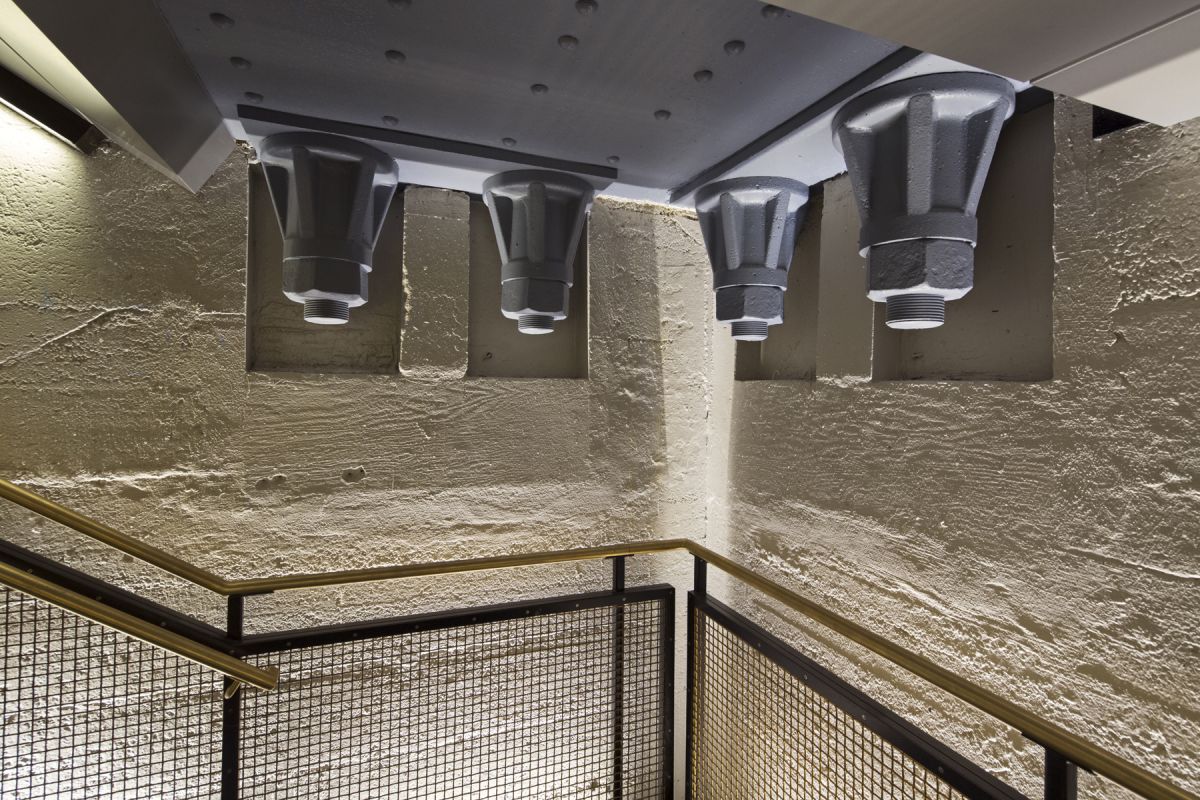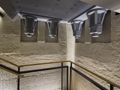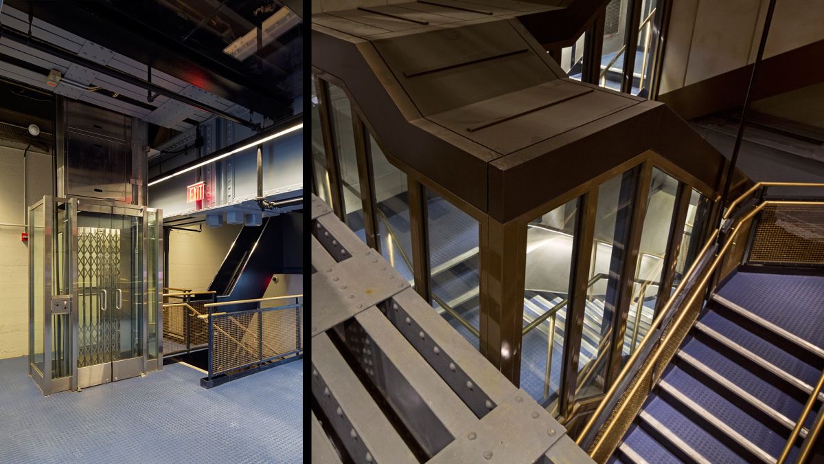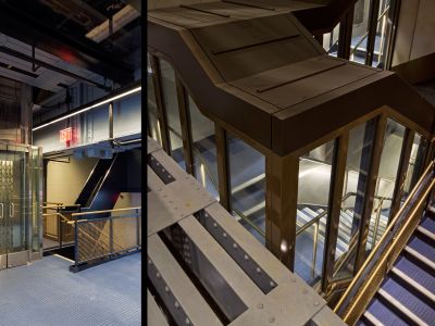 In the first phase of work, M+Sa served as architectural advisor to the NPS for improvements to the double helix stairs that allowed access to the Crown, which had been closed since 9/11. The next phase was a much larger project in the granite Pedestal to design two new stairs, a new main elevator, an emergency elevator to shoulder height in the Statue, a new platform lift providing wheelchair access to the observation level for the first time, as well as air conditioning, ventilation, and emergency systems. The intent of the design was to retain as much of the feeling of the space within the shaft as possible, as well as its industrial aesthetic. The metal and glass stairs intertwine through the space, appearing to be free of the walls, and leaving the original girders visible and untouched. Lighting serves to accent the historic features and material textures, as well as to provide destinations as the stairs wind through the Pedestal.