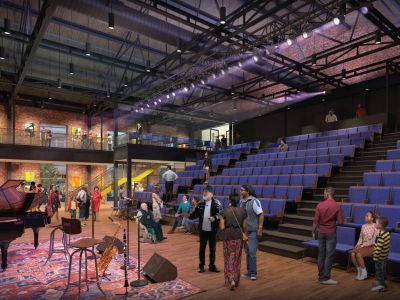 A new accessible lobby affords access to the facility through a repurposed retail space. Gallery space for the display of artwork is woven throughout the building, and a dual-function coffee bar is designed to serve as a concession for the performance area and a café for other patrons. Original second floor office spaces will be repurposed to accommodate art and music classrooms, as well as small lectures and film screenings. A new dance studio is designed as part of a new second floor structure within the volume of the original auditorium area. New restrooms and elevator access serve all floors. New fenestration is proposed to enliven lobby spaces and provide a visual connection between pedestrian and patron zones.
